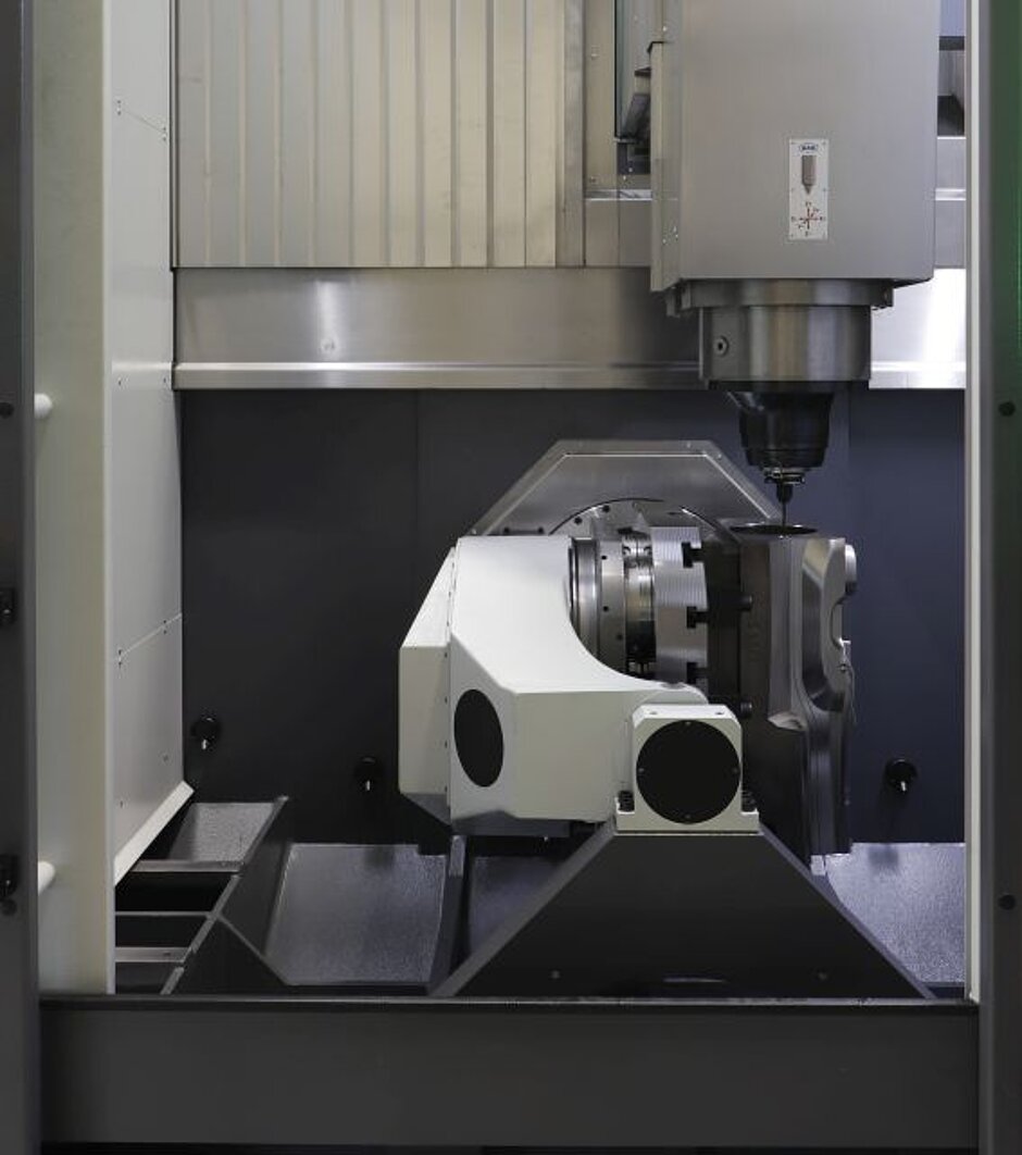 Ausgerüstet mit Schwenkspindel und dem im Maschinentisch integrierten Rundtisch RTA 5 TD mit 850 mm Planscheibe und einem Drehbetrieb von max. 500 1/min ist die VHC ideal für die 5-Seiten-Bearbeitung.