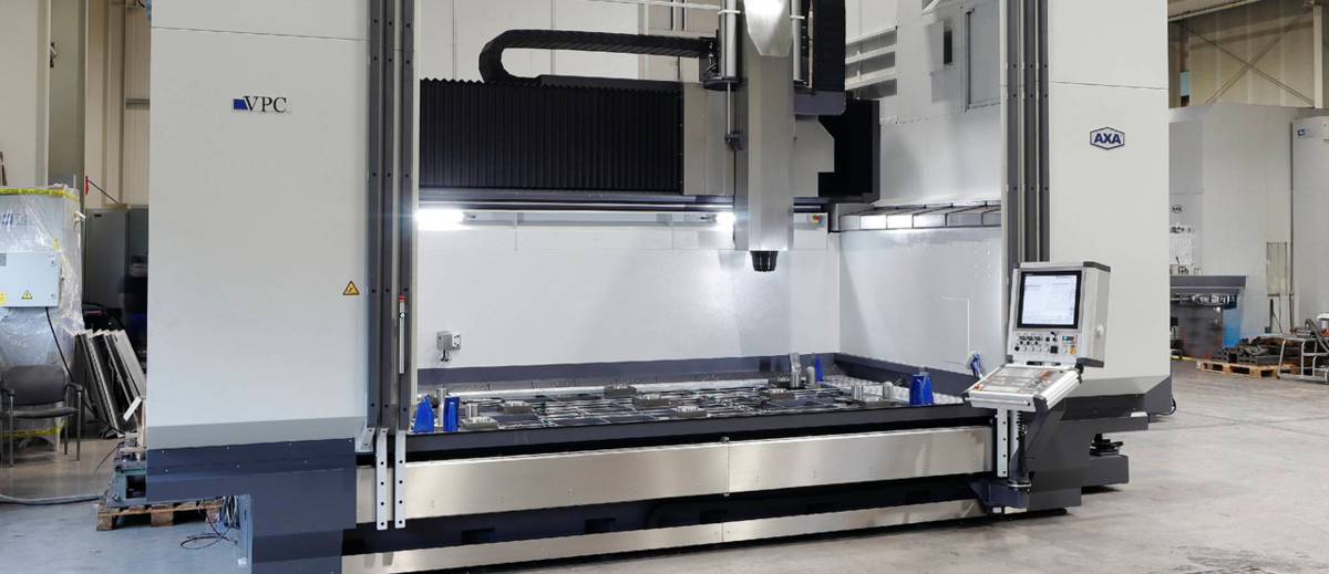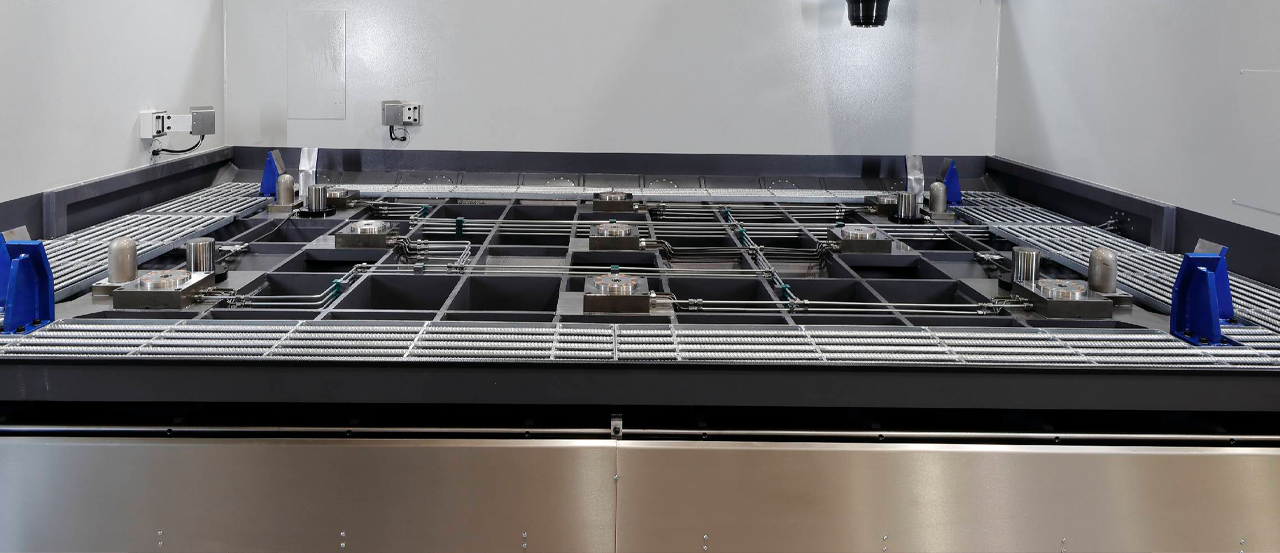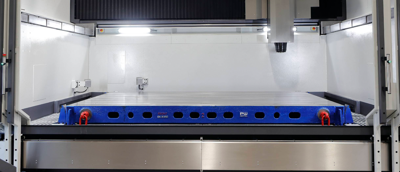 Lösung:- Ausführung der Maschine ohne festen Maschinentisch. Stattdessen sind zur Aufnahme von kundenseitigen Spannpaletten Nullpunktspanner im Maschinenständer integriert.