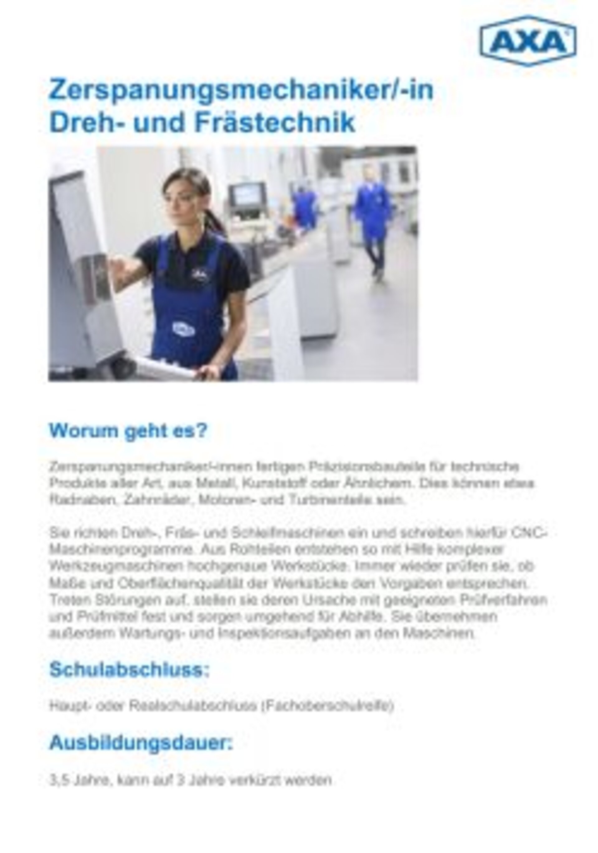Auch wenn die Rahmenpläne für die Ausbildung zum Zerspanungsmechaniker(m/w/d) immer gleich sind, kann die praktische Umsetzung sehr unterschiedlich sein. In unserem "Ausbildungsflyer Zerspanungsmechaniker" wird der Aufbau speziell bei AXA erklärt.