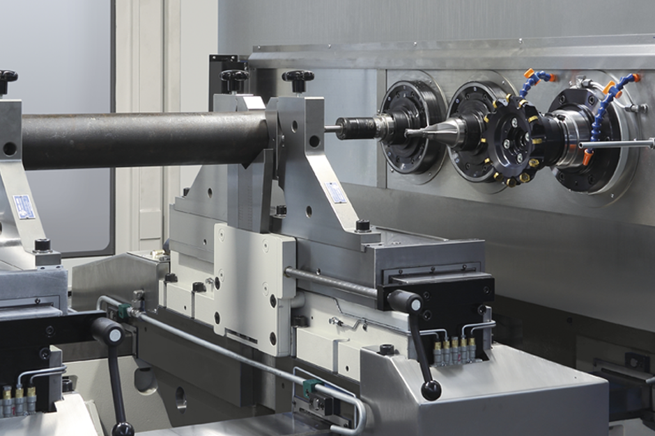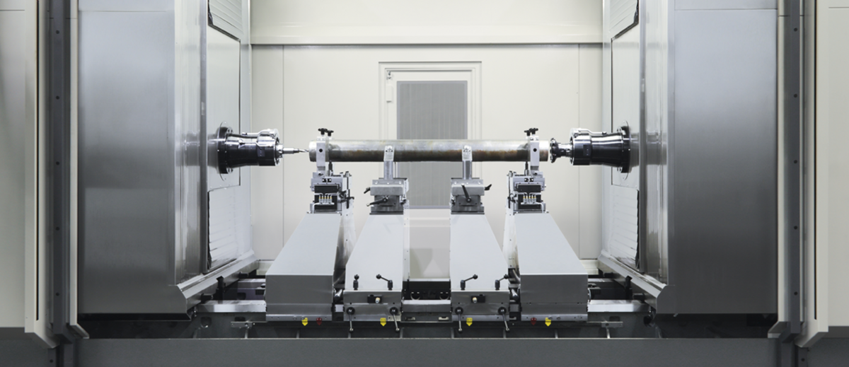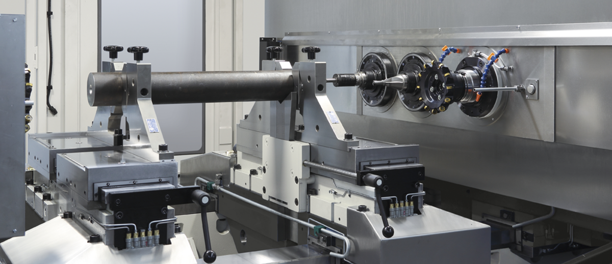 Für die stirnseitige Bearbeitung von bspw. Rundstangen oder Rohren kommen häufig Enden-Bearbeitungszentren zum Einsatz. Sie ermöglichen sowohl die ein- als auch beidseitige Bearbeitung der Werkstückenden.